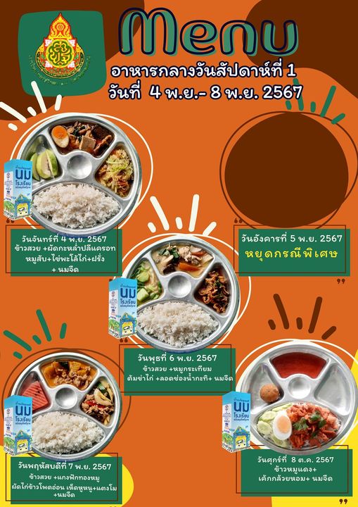 รายการอาหารกลางวัน สัปดาห์ที่ 1 วันที่ 4 พ.ย.- 8 พ.ย 2567