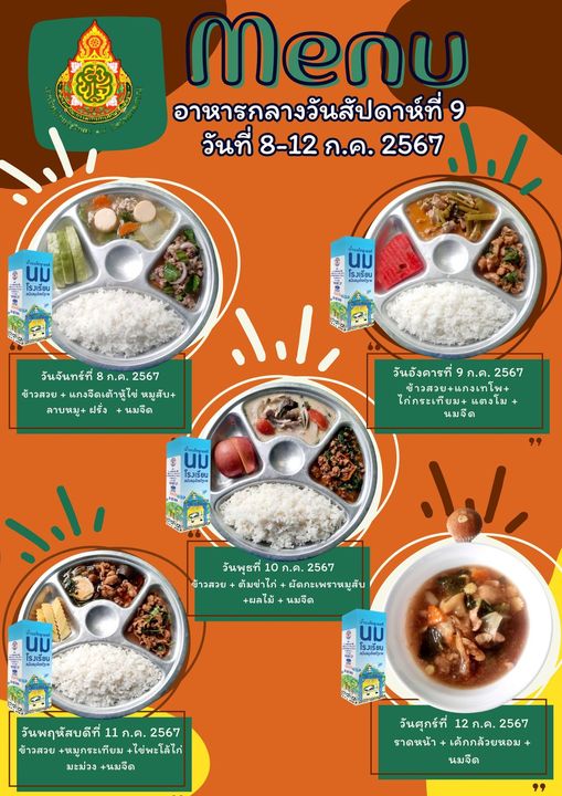 รายการอาหารกลางวัน สัปดาห์ที่ 9 วันที่ 8-12 กรกฏาคม 2567