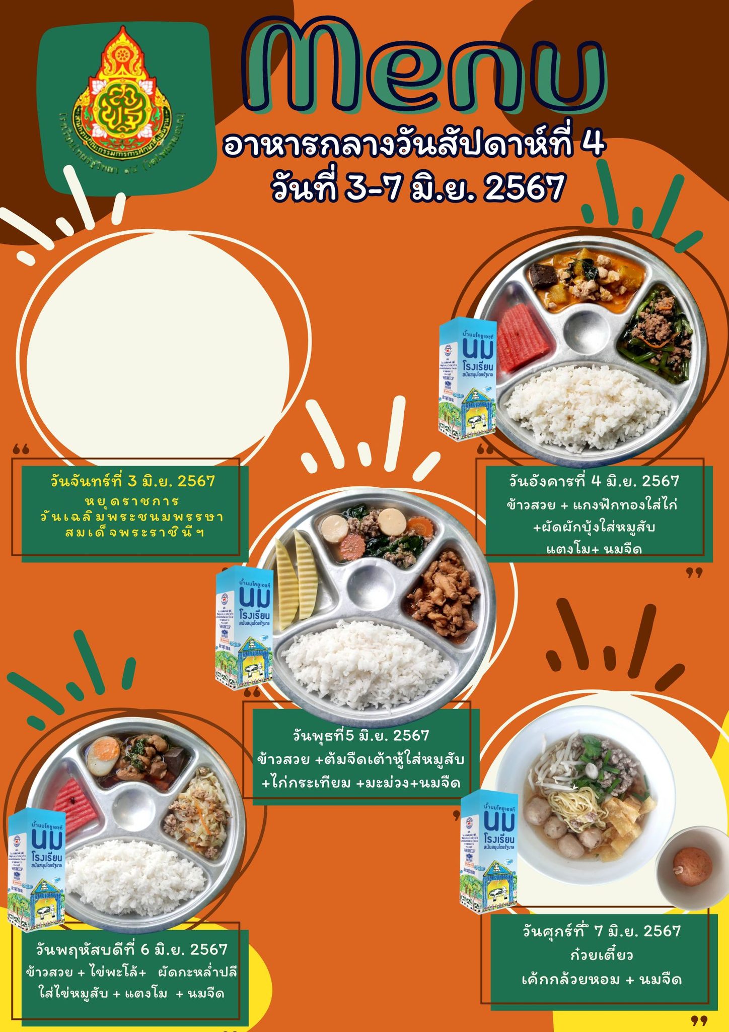 รายการอาหารกลางวัน สัปดาห์ที่ 4 วันที่ 3-7 มิถุนายน 2567