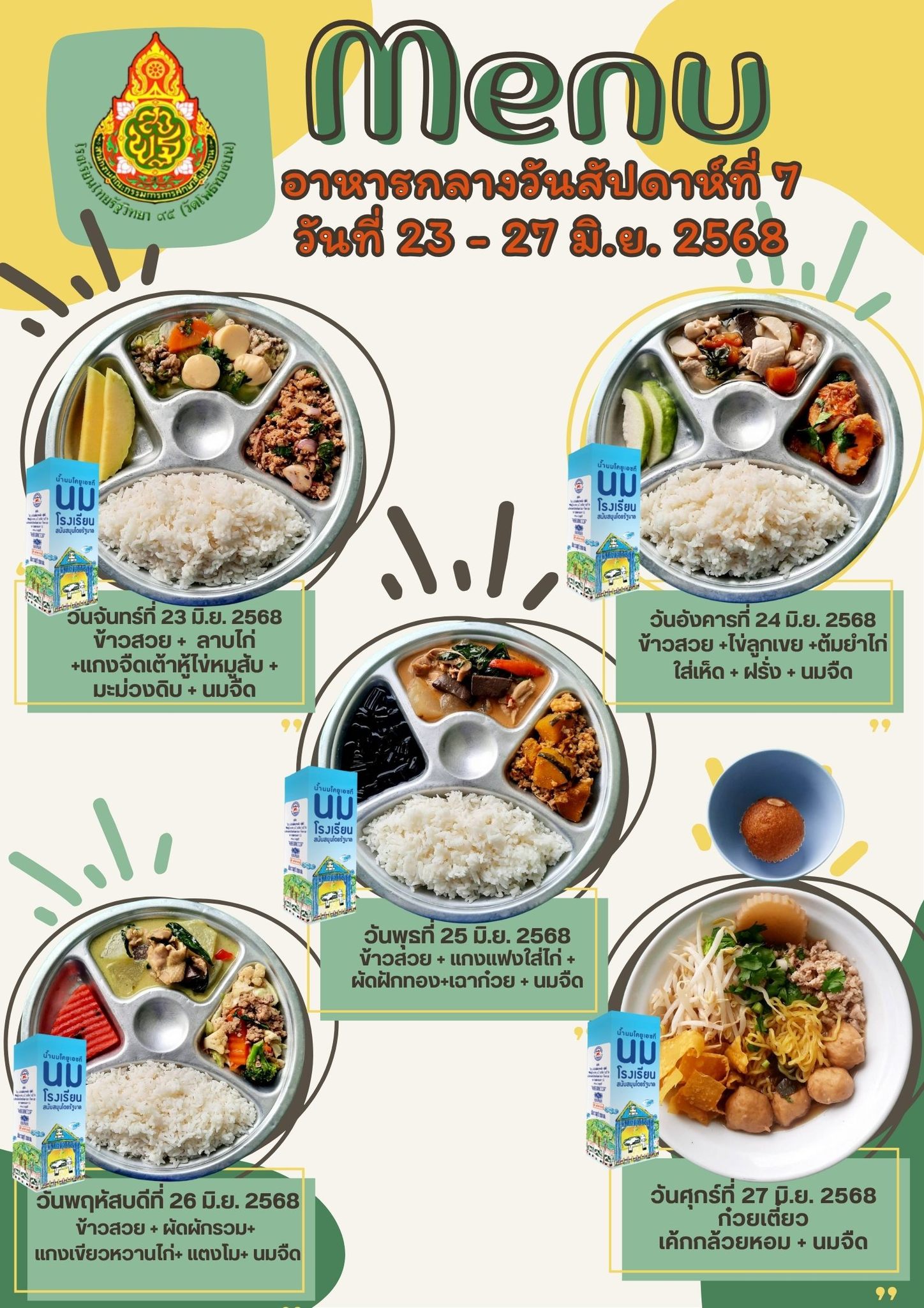 รายการอาหารกลางวัน สัปดาห์ที่ 7วันที่ 23 มิ.ย.- 27 มิ.ย. 2568