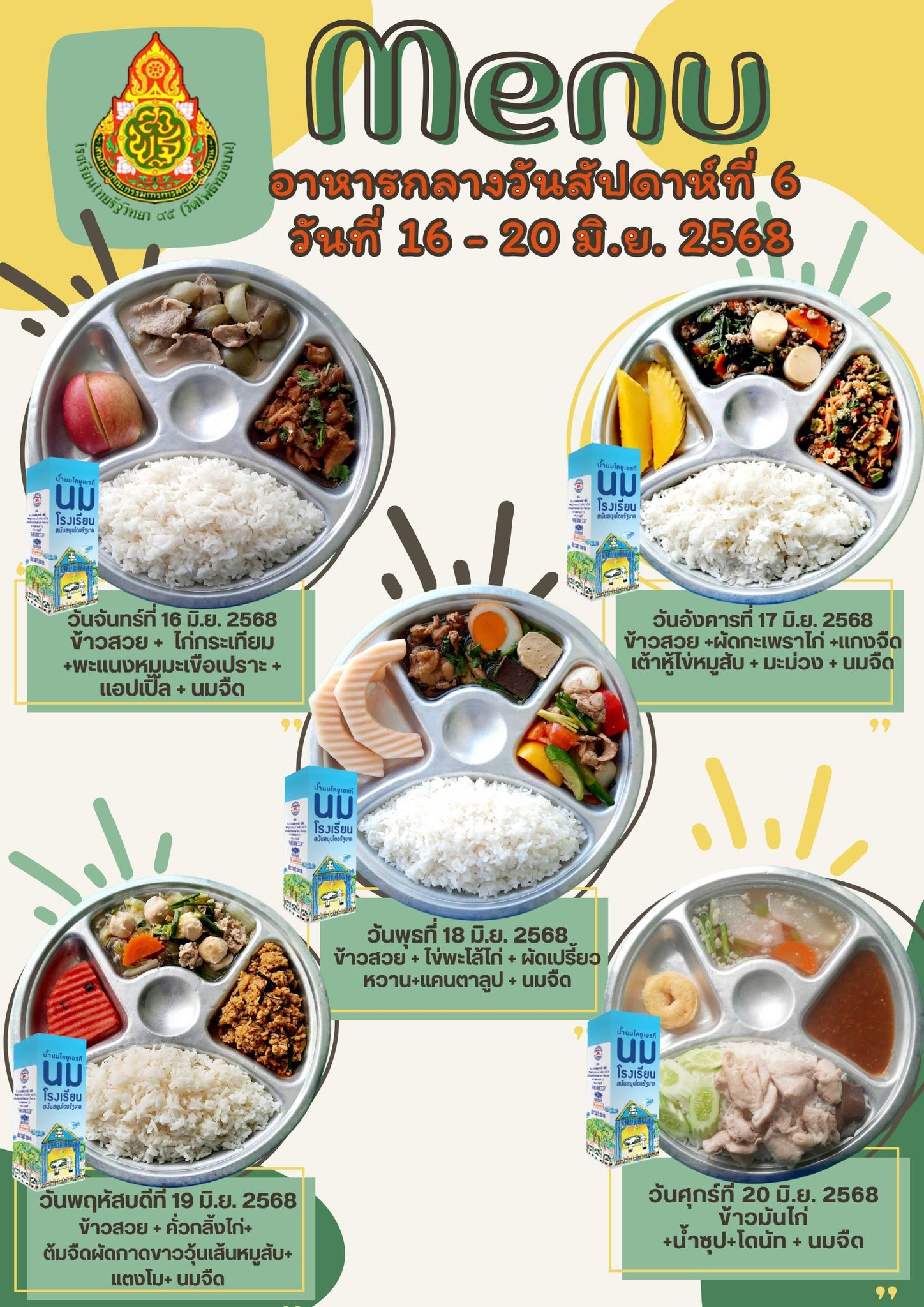 รายการอาหารกลางวัน สัปดาห์ที่ 6วันที่ 16 มิ.ย.- 20 มิ.ย. 2568