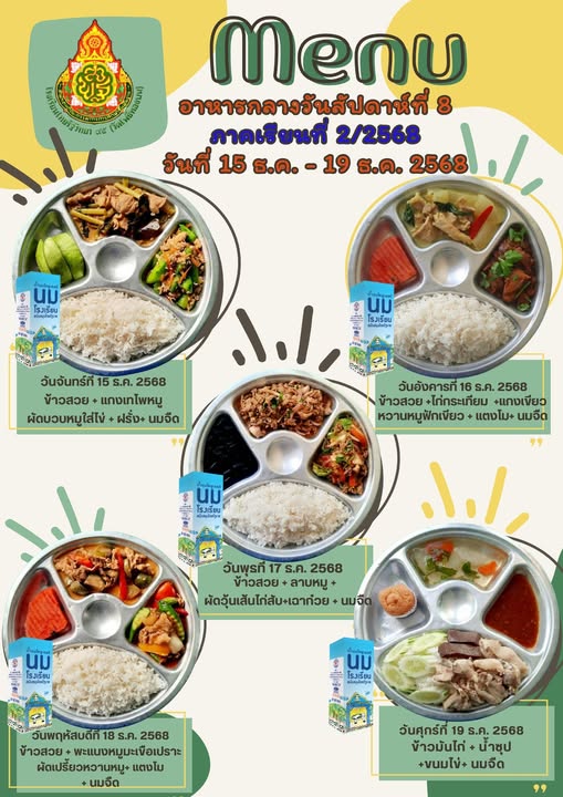 รายการอาหารกลางวัน สัปดาห์ที่ 8 ภาคเรียนที่ 2/2568 วันที่ 15 ธ.ค.- 19 ธ.ค. 2568