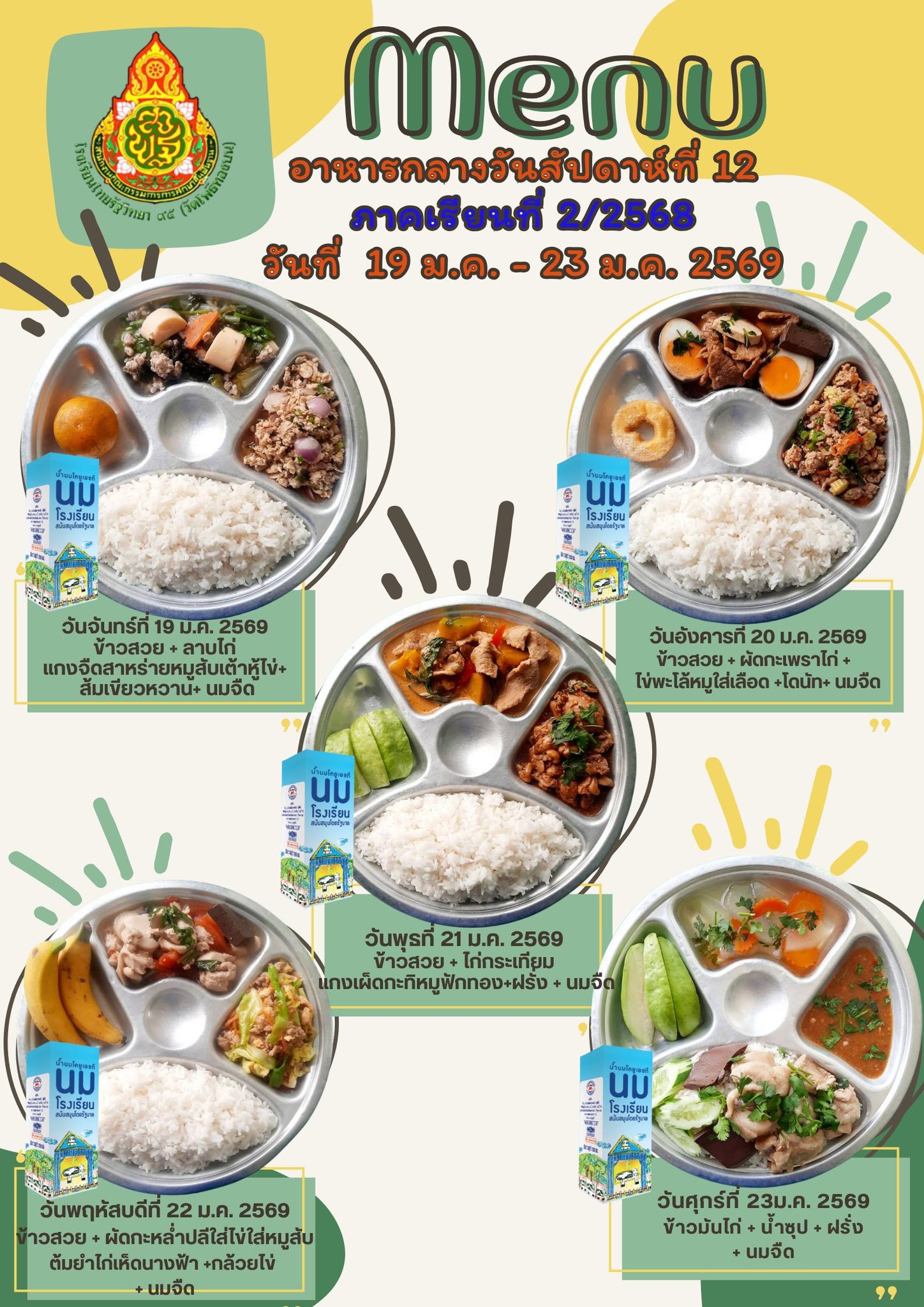 รายการอาหารกลางวัน สัปดาห์ที่ 12 ภาคเรียนที่ 2/2568 วันที่ 19 ม.ค.- 23 ม.ค. 2569