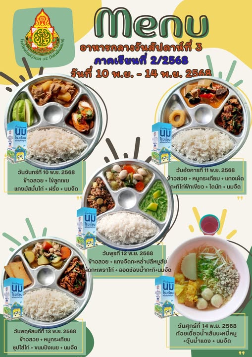 รายการอาหารกลางวัน สัปดาห์ที่ 3 ภาคเรียนที่ 2/2568 วันที่ 10 พ.ย.- 14 พ.ย. 2568