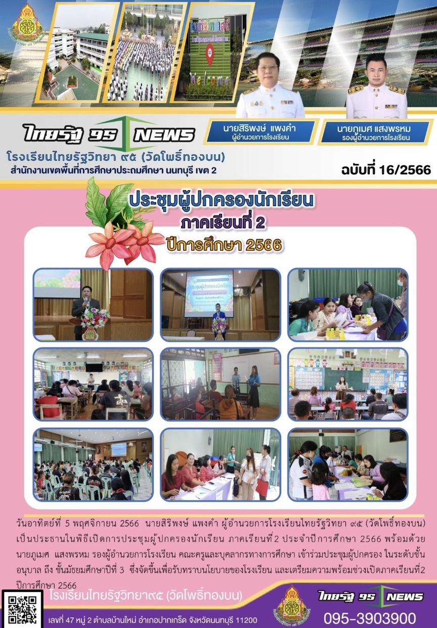 วันอาทิตย์ที่ 5 พฤศจิกายน 2566 นายสิริพงษ์ แพงคำ ผู้อำนวยการโรงเรียนไทยรัฐวิทยา ๙๕ (วัดโพธิ์ทองบน) เป็นประธานในพิธีเปิดการประชุมผู้ปกครองนักเรียน ภาคเรียนที่2 ประจำปีการศึกษา 2566 พร้อมด้วย นายภูเมศ แสงพรหม รองผู้อำนวยการโรงเรียน คณะครูและบุคลากรทางการศึกษา เข้าร่วมประชุมผู้ปกครอง ในระดับชั้นอนุบาล ถึง ชั้นมัธยมศึกษาปีที่ 3 ซึ่งจัดขึ้นเพื่อรับทราบนโยบายของโรงเรียน และเตรียมความพร้อมช่วงเปิดภาคเรียนที่2 ปีการศึกษา 2566 |