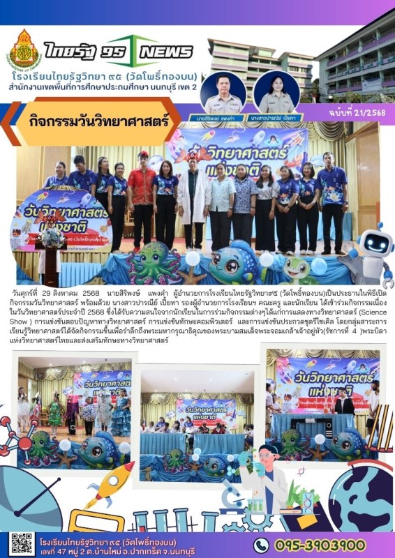 วันศุกร์ที่ 29 สิงหาคม 2568 นายสิริพงษ์ แพงคำ ผู้อำนวยการโรงเรียนไทยรัฐวิทยา๙๕ (วัดโพธิ์ทองบน)เป็นประธานในพิธีเปิด กิจกรรมวันวิทยาศาสตร์ พร้อมด้วย นางสาวปารณีย์ เปี้ยทา รองผู้อำนวยการโรงเรียนฯ คณะครู และนักเรียน ได้เข้าร่วมกิจกรรมเนื่องในวันวิทยาศาสตร์ประจำปี 2568 ซึ่งได้รับความสนใจจากนักเรียนในการร่วมกิจกรรมต่างๆได้แก่การแสดงทางวิทยาศาสตร์ (Science Show ) การแข่งขันตอบปัญหาทางวิทยาศาสตร์ การแข่งขันทักษะคอมพิวเตอร์ และการแข่งขันประกวดชุดรีไซเคิล โดยกลุ่มสาระการเรียนรู้วิทยาศาสตร์ได้จัดกิจกรรมขึ้นเพื่อรำลึกถึงพระมหากรุณาธิคุณของพระบาทสมเด็จพระจอมเกล้าเจ้าอยู่หัว(รัชการที่ 4 )พระบิดาแห่งวิทยาศาสตร์ไทยและส่งเสริมทักษะทางวิทยาศาสตร์ |
