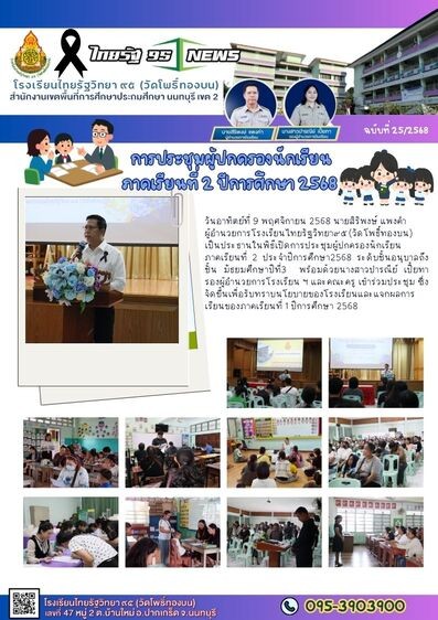 วันอาทิตย์ที่ 9 พฤศจิกายน 2568 นายสิริพงษ์ แพงคำผู้อำนวยการโรงเรียนไทยรัฐวิทยา๙๕(วัดโพธิิ์ทองบน)เป็นประธานในพิธีเปิดการประชุมผู้ปกครองนักเรียน ภาคเรียนที่ 2 ประจำปีการศึกษา2568 ระดับชั้นอนุบาลถึง ชั้น มัธยมศึกษาปีที่3 พร้อมด้วยนางสาวปารณีย์ เปี้ยทา รองผู้อำนวยการโรงเรียน ฯ และคณะครู เข้าร่วมประชุม ซึ่งจัดขึ้นเพื่อรับทราบนโยบายของโรงเรียนและแจกผลการเรียนของภาคเรียนที่ 1 ปีการศึกษา 2568 |