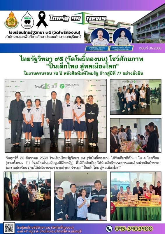 วันศุกร์ที่ 26 ธันวาคม 2568 โรงเรียนไทยรัฐวิทยา ๙๕ (วัดโพธิ์ทองบน) ได้รับเกียรติเป็น 1 ใน 4 โรงเรียน (จากทั้งหมด 111 โรงเรียนในเครือมูลนิธิไทยรัฐ) ที่ได้รับคัดเลือกให้ร่วมจัดนิทรรศการและจำหน่ายสินค้าจาก ผลงานนักเรียน ภายใต้ปณิธานของ นายกำพล วัชรพล “ปั้นเด็กไทย สู่พลเมืองโลก” |