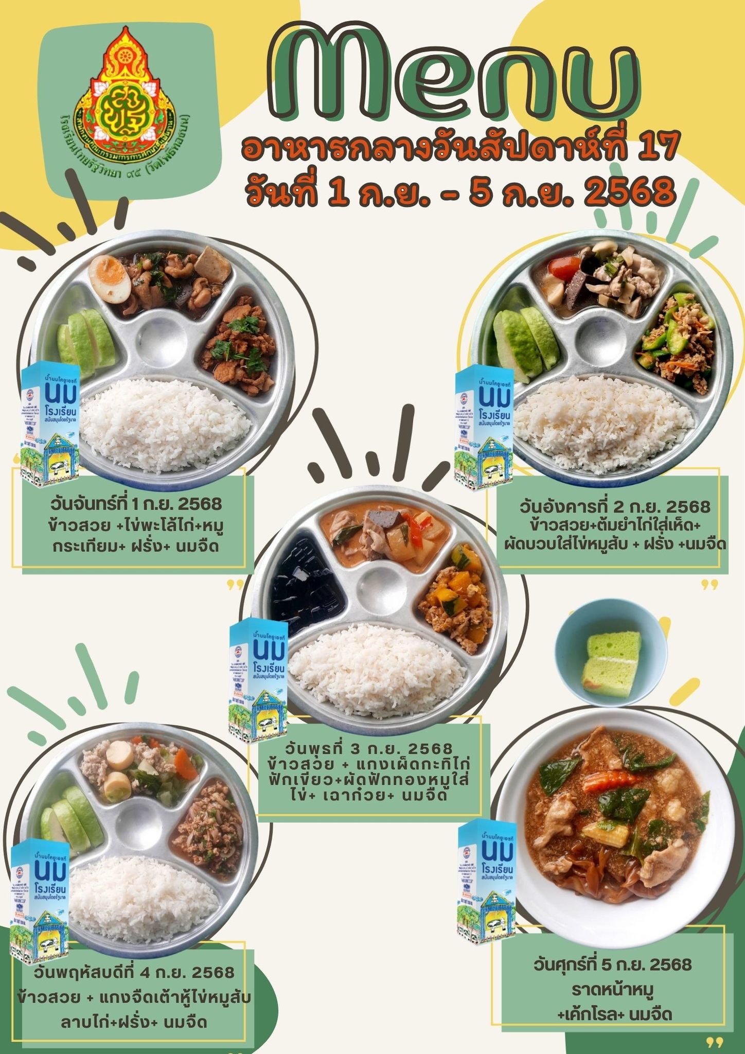 รายการอาหารกลางวัน สัปดาห์ที่ 17 วันที่ 1ก.ย.- 5 ก.ย. 2568