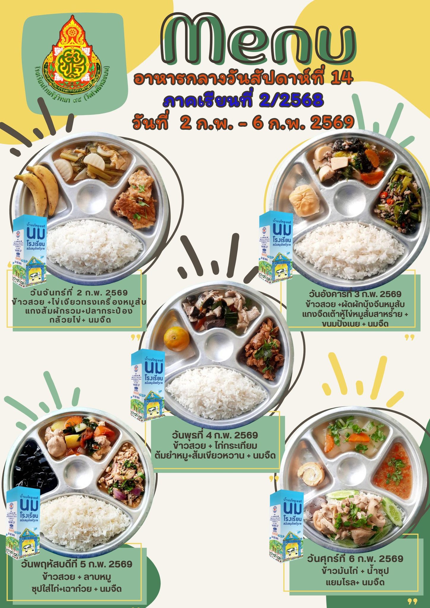 รายการอาหารกลางวัน สัปดาห์ที่ 14 ภาคเรียนที่ 2/2568 วันที่ 2 ก.พ.- 6 ก.พ. 2569