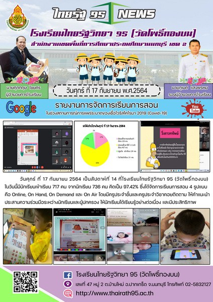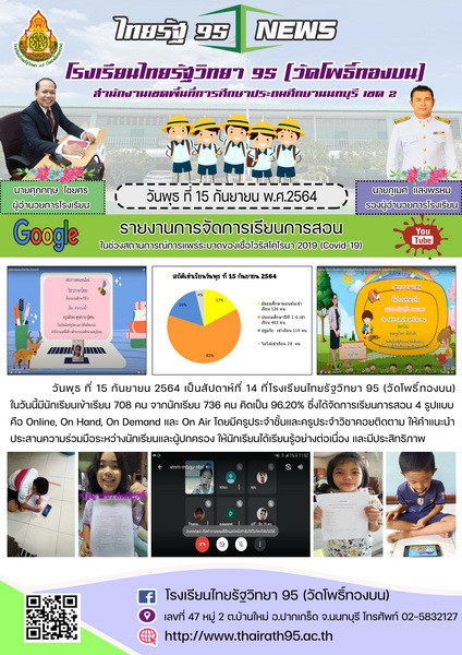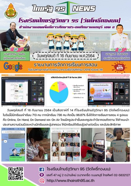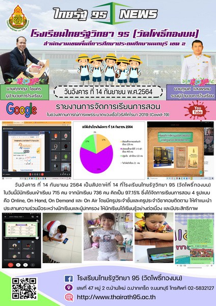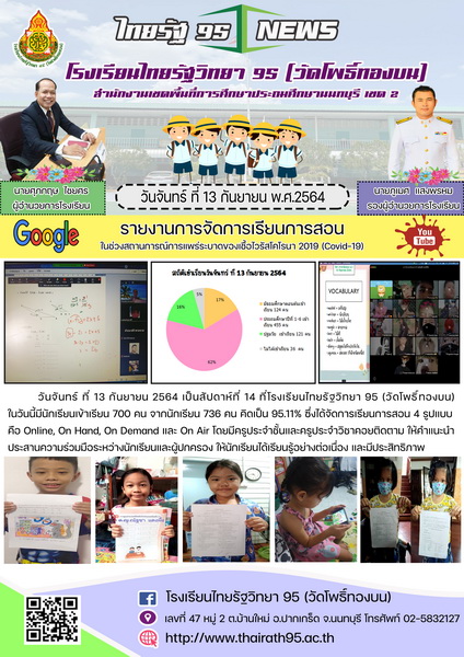 รายงานการจัดการเรียนการสอนในช่วงสถานการณ์การแพร่ระบาดของโรค Covid -19 ภาคเรียน 1 /2564 ระหว่างวันที่ 13-17 กันยายน 2564