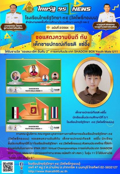 ขอแสดงความยินดี กับ เด็กชายปกรณ์เกียรติ แซ่อึ้ง ได้รับรางวัล รายการ IFMA 2021 Virtual Championships การแข่งขันประเภท SHADOW BOX Youth Male U11